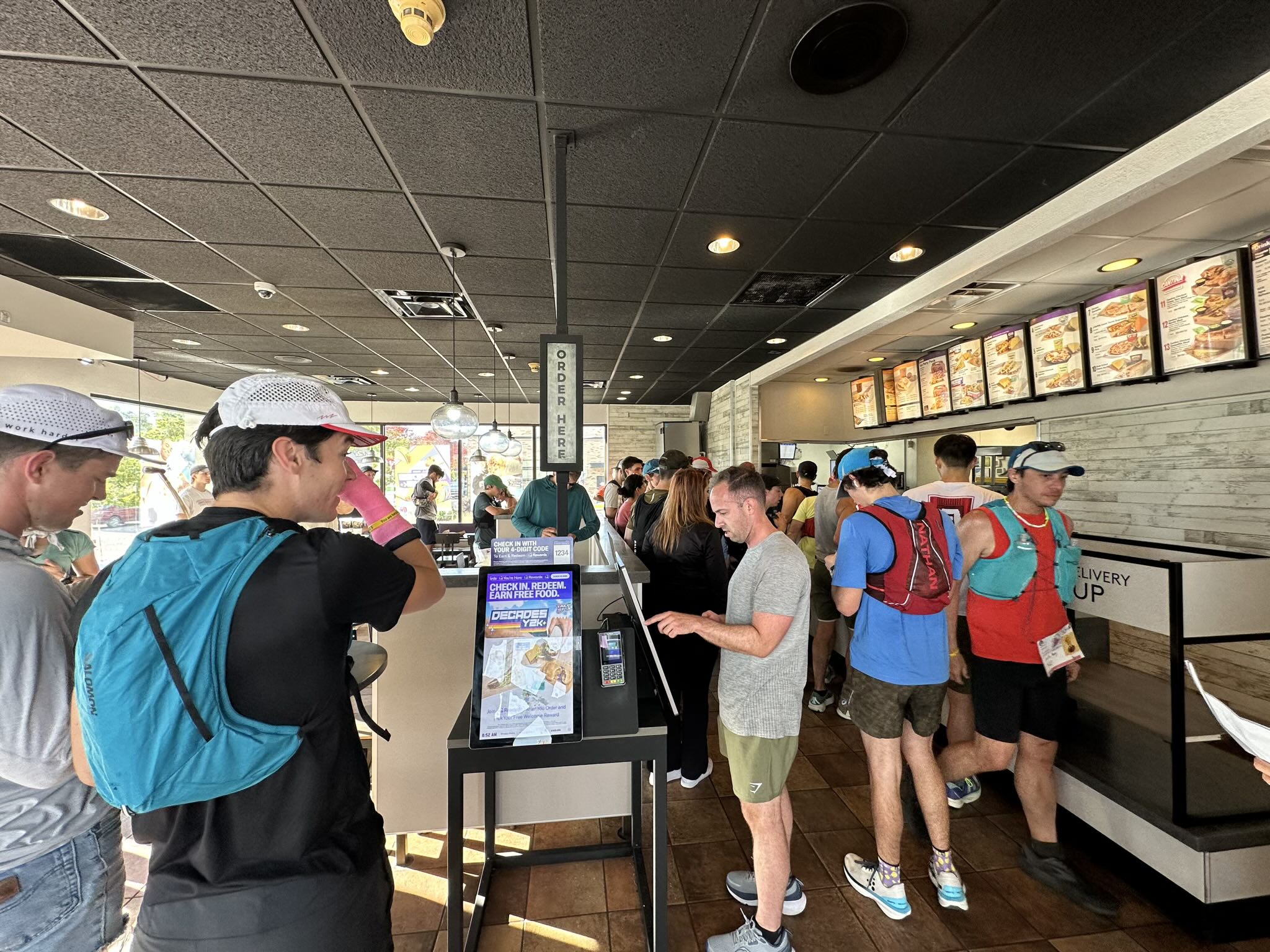 By Taco Bell #4, chaos had erupted. The store was overrun with not only some runners who had caught up to me, but with a hundred pre-orders that were bagged and resting on their take-out counter. I waited nearly 12 minutes just to order my food. I there and then realized that I was not going to be able to efficiently order food in person at any of the remaining Taco Bells. So during the wait, I downloaded the Taco Bell app and started placing mobile orders for the rest of the stops at least 30 minutes in advance. Modern problems require modern solutions.
