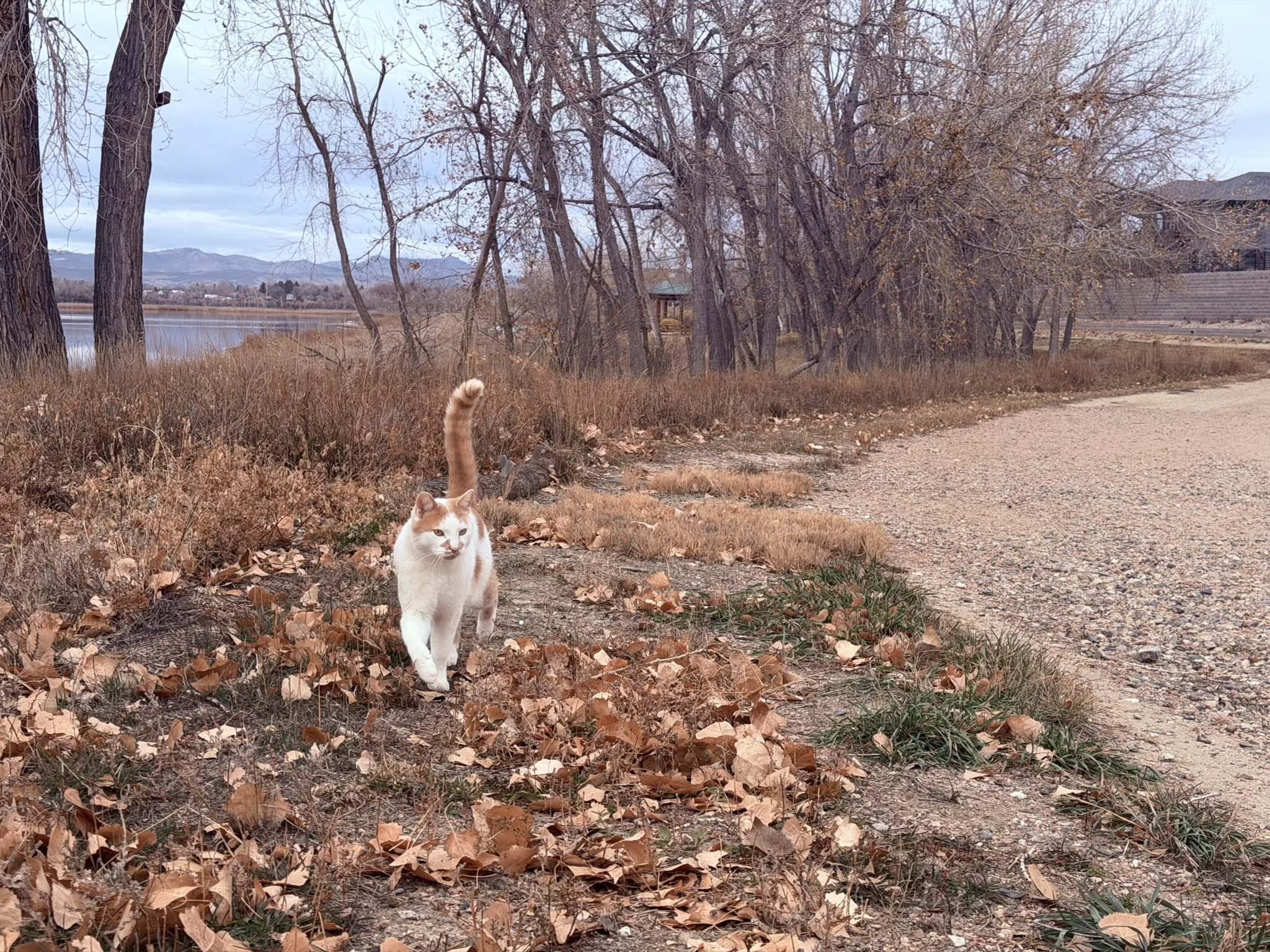 About 400 meters from home, I encountered a friendly cat on the trail. I stopped to pet it, then walked toward the little beach at Richards Lake to take a few pictures.