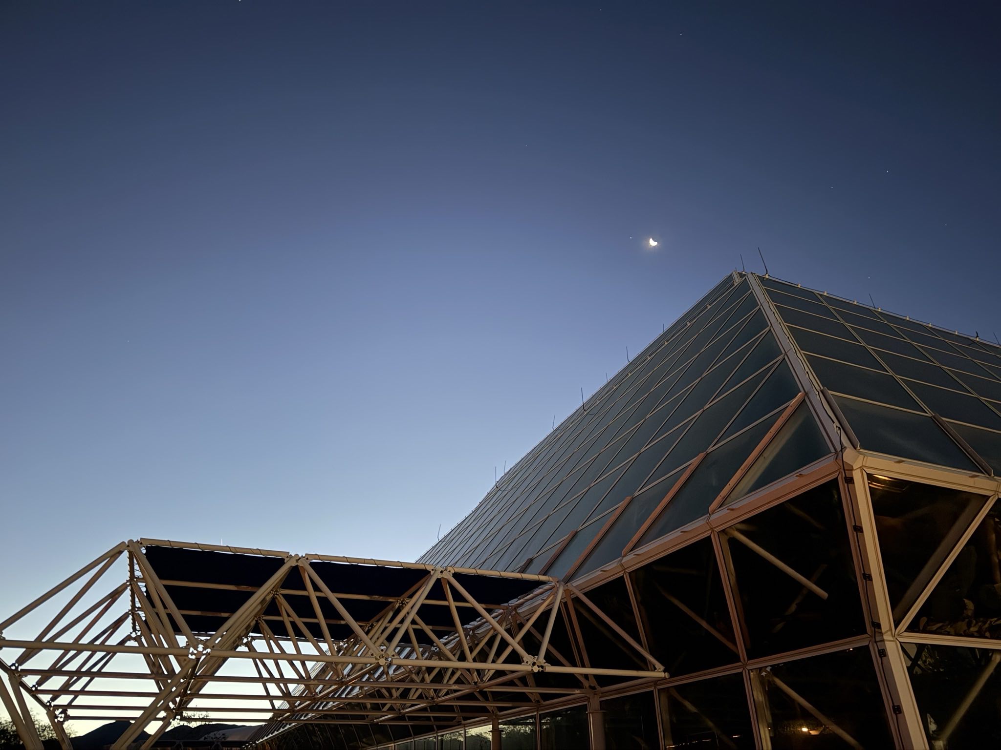 A crescent moon loomed over Biosphere 2 before the start of the 2025 Tucson Marathon.