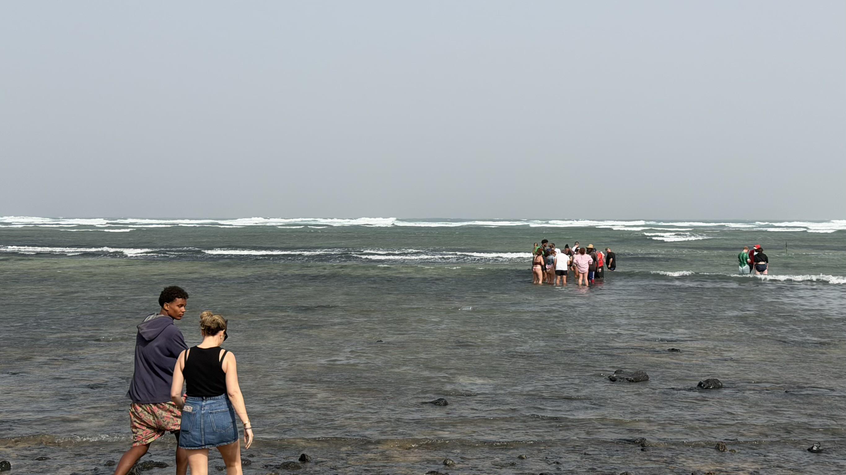 Third on the itinerary, and the clear highlight of the tour: Shark Bay, on the island’s eastern coast. After arriving and paying a few euros to borrow some water sandals (think Crocs), Andrea and I followed a local guide and waded into the shallow, rocky water.
