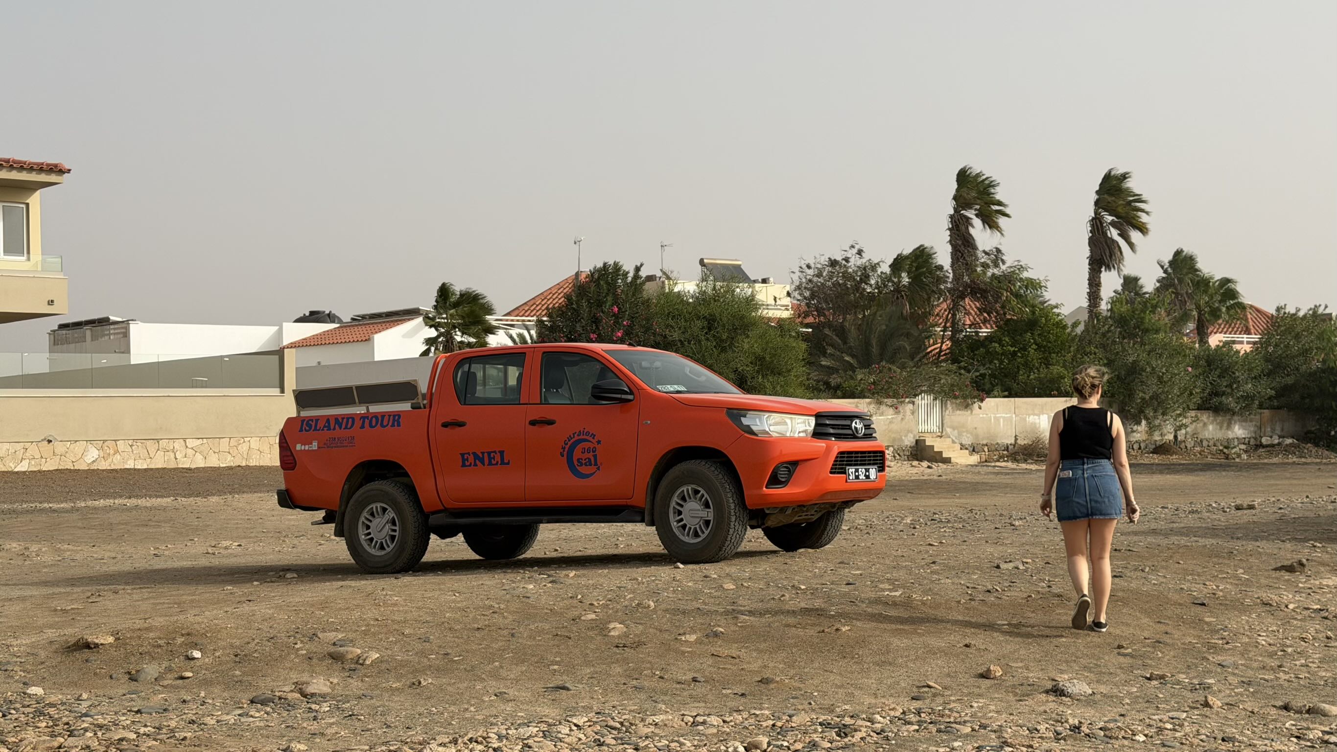 On our first full day in Sal, Andrea and I booked a private four-hour tour with a local guide named Enel, which cost 150 euros total and arranged by Ocean Suites. If there was any question about whether this was the better choice over a less expensive group tour, that was quickly answered on the the roads that afternoon. The alternative was a full-day group excursion—seven strangers, an old pickup truck, unrestrained seating in the open bed, the Saharan sun doing its best, and the road doing its worst. That it was even an option seemed like a liability waiver waiting to happen.