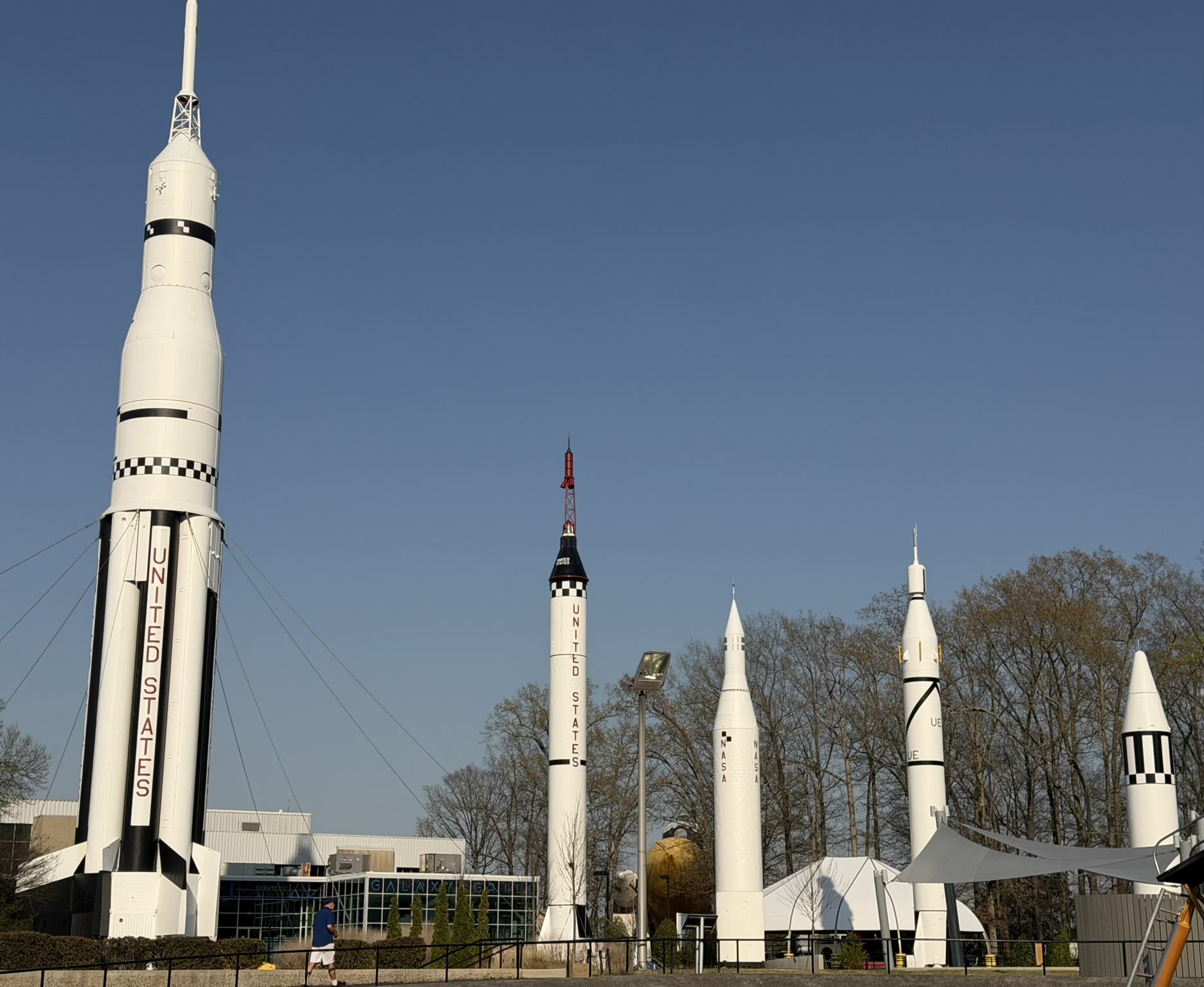 The outdoor grounds announce themselves immediately. Rockets of various sizes stand between the two main museum buildings like sentinels at a very ambitious garden party—Saturn I, the first American launch vehicle developed solely for space exploration, among them. Saturn I had a 100% mission success rate and was first static-tested right here in Huntsville, which seems like the kind of hometown detail worth putting on a bumper sticker. Nearby, a missile launcher and military helicopter sit alongside other hardware, reminders that the line between defense technology and space exploration has always been blurry.