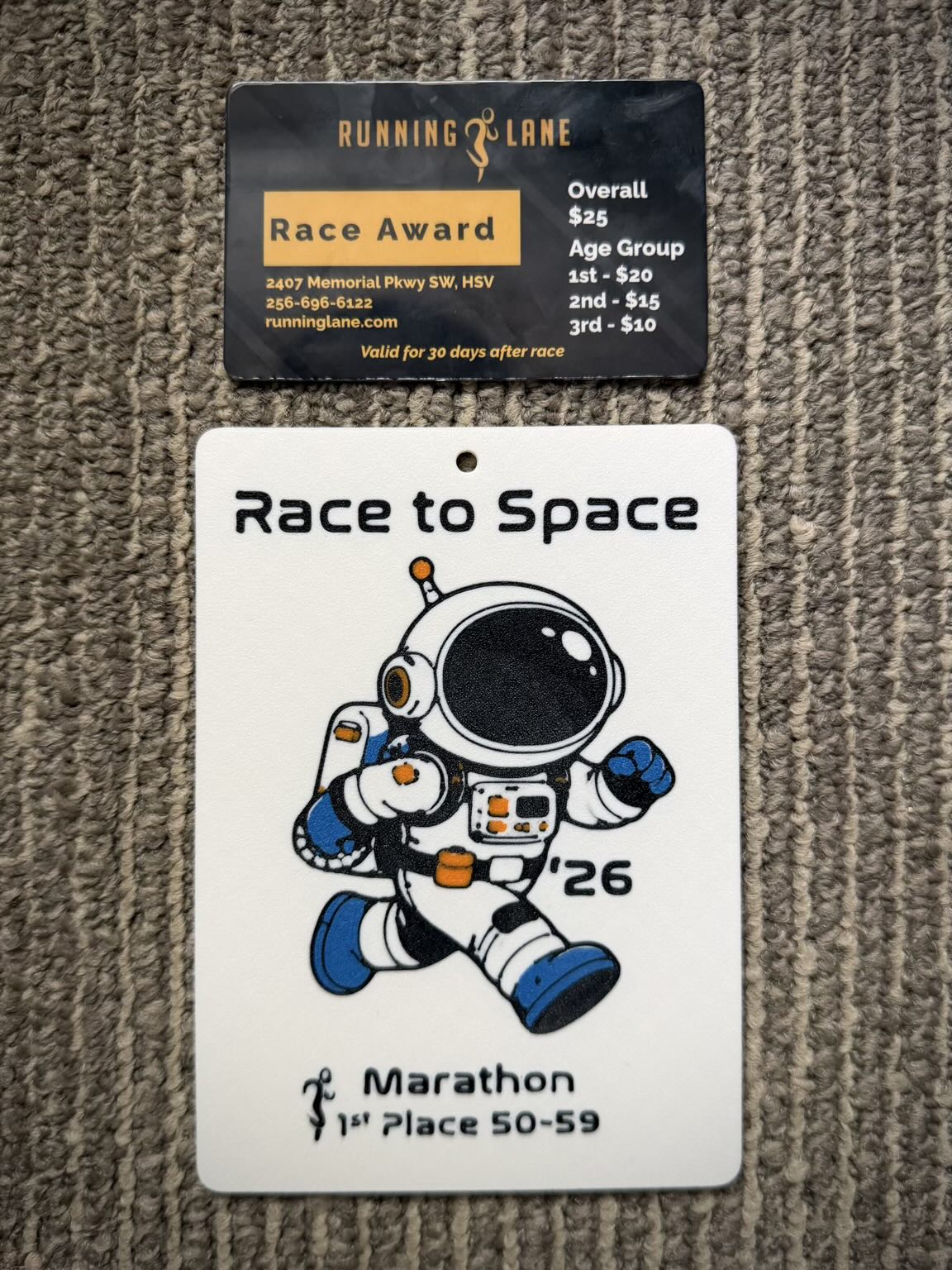 To settle that score and to check Alabama off my 50<4 list—running a marathon in all 50 states in less than four hours—I signed up for the Race to Space Marathon in Huntsville. Huntsville happens to be home to the U.S. Space & Rocket Center, and the race bib was good for a ten-dollar discount off the normal entry fee. I am unsure if the discount was strictly necessary to lure runners into the museum—I certainly would have gone there in any case—but it was a delightful perk.