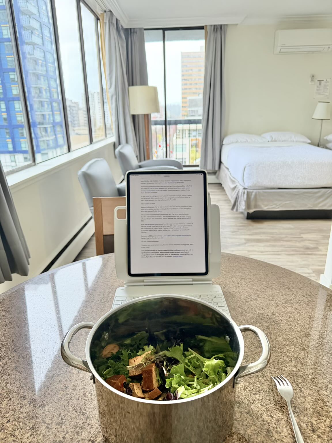 I walked to the Whole Foods for salad ingredients, then settled in for what turned out to be an unexpectedly historic afternoon. On April 1—April Fools’ Day, of all days—NASA launched Artemis II: the first crewed mission beyond low Earth orbit since Apollo 17 in December 1972. Four astronauts aboard the Orion spacecraft, including Canadian Space Agency astronaut Jeremy Hansen, lifted off from Kennedy Space Center at 6:35 p.m. EDT and began a 10-day journey around the Moon. Watching from a hotel balcony in Vancouver—Hansen’s home country—while eating a large salad felt like exactly the right place and the right way to witness it. I watched, ate, rested, worked, and generally did not feel guilty about any of it.