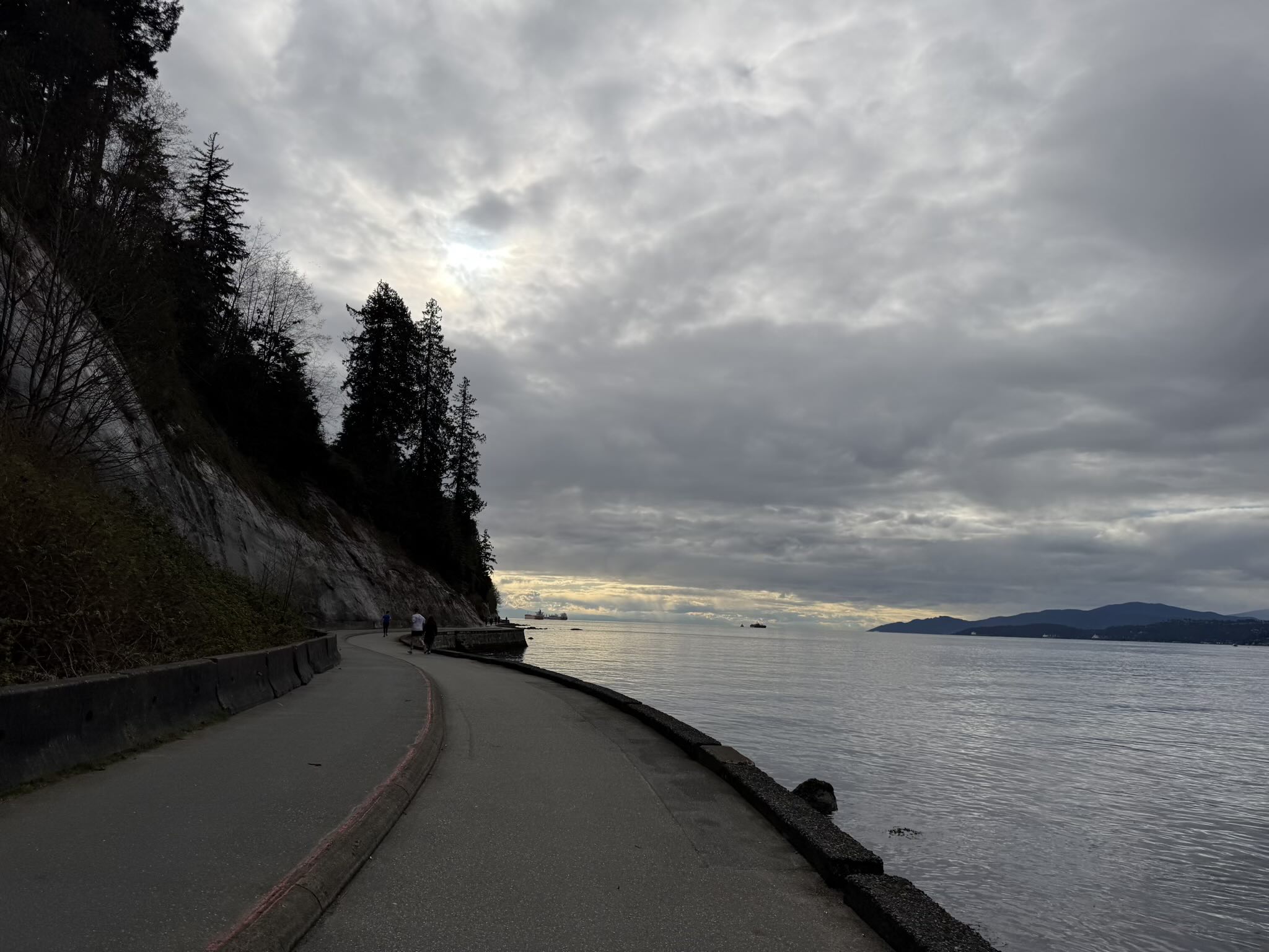 It wasn’t raining—just a faint drizzle at the start, the kind that’s more atmosphere than precipitation. I began at Bayshore West Marina and ran west along the Seawall, the 28-kilometer path that wraps around Stanley Park and continues along the waterfront in both directions. The Stanley Park section alone is nine kilometers; by the time I turned around at 10.6 kilometers, I had essentially circumnavigated the park.