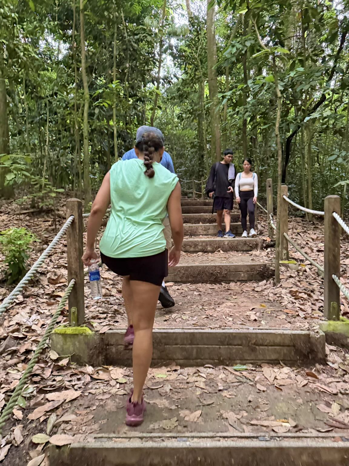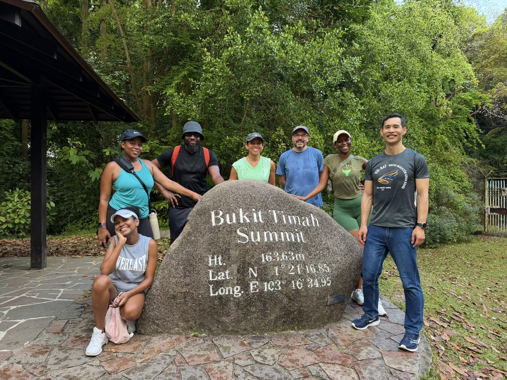 From Dairy Farm, the group hiked up to the Bukit Timah summit—Singapore’s highest natural point at 163.63 meters (537 feet), marked by a large boulder engraved with the name and elevation. The steps leading up were steep enough that they gave the group pause; for me, hiking regularly at a mile above sea level in Fort Collins, the altitude itself wasn’t the challenge. The humidity, on the other hand, was its own category of experience. I was sweating at a pace that suggested my body had simply given up on the concept of staying dry and decided to commit fully to the alternative.