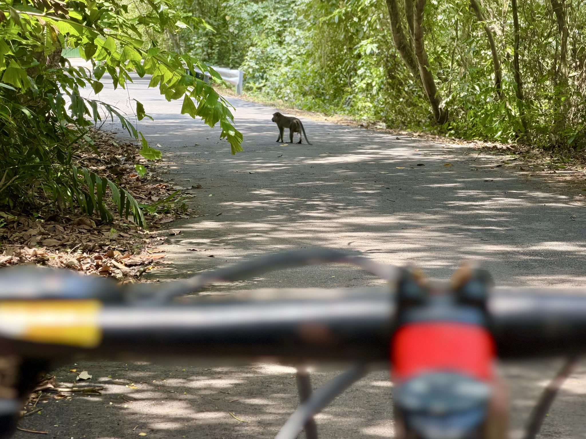 The wildlife was less shy than in the nature parks. Midway through a trail, we came around a corner to find a monkey sitting in the road with the self-possession of a toll booth operator. We stopped. It looked at us. It did not move.