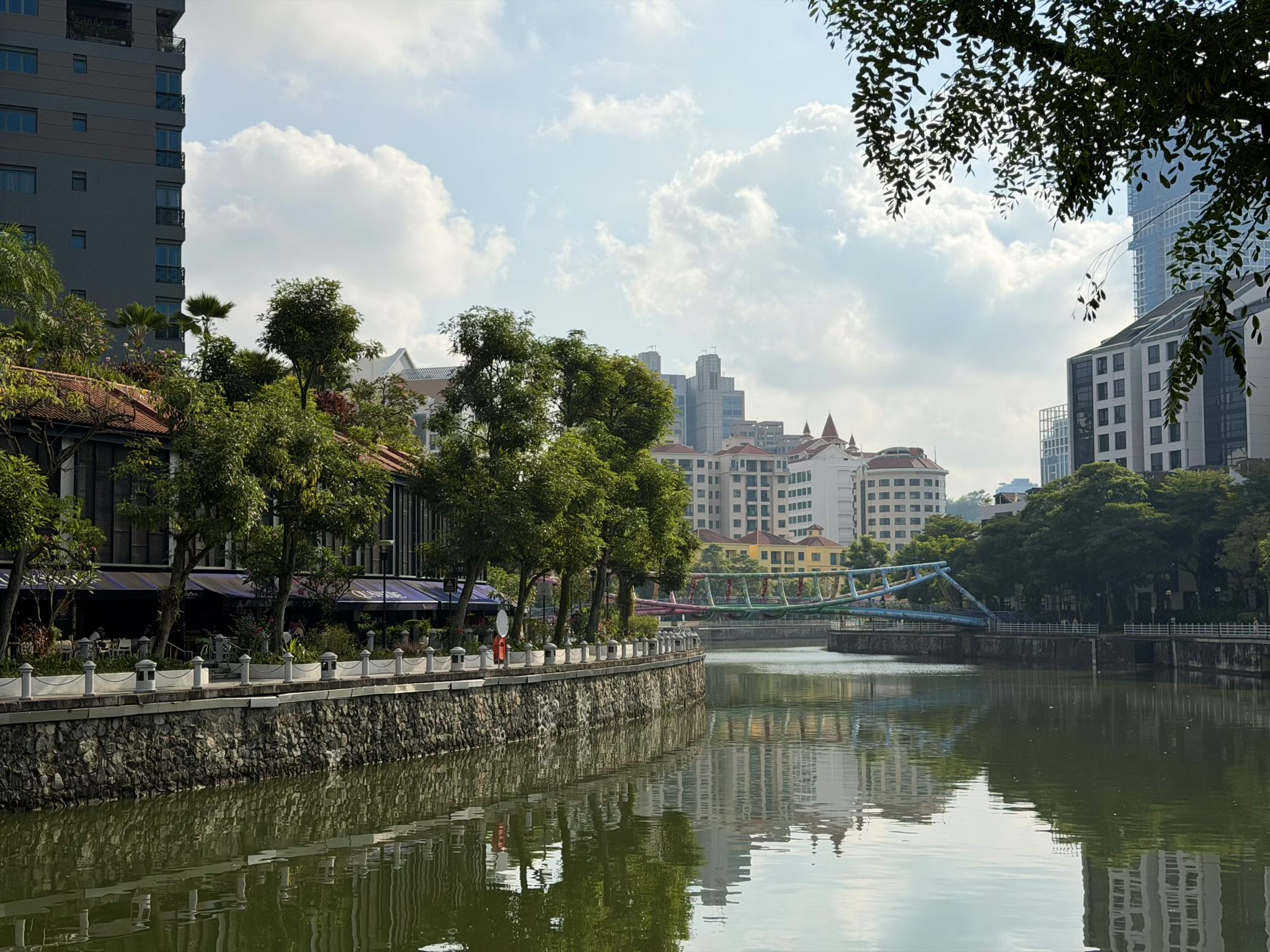 Both Apple Maps and Google Maps recommended taking the bus into the city—multiple transfers included—because there’s no direct train from the airport to the city center at that hour. I set off gamely on the first bus, missed a transfer stop, then missed several more buses I was meant to catch, all while knowing that James and Leanne were waiting for me at Robertson Quay. Eventually I abandoned all pretense of figuring out the bus network and walked to a taxi stand.